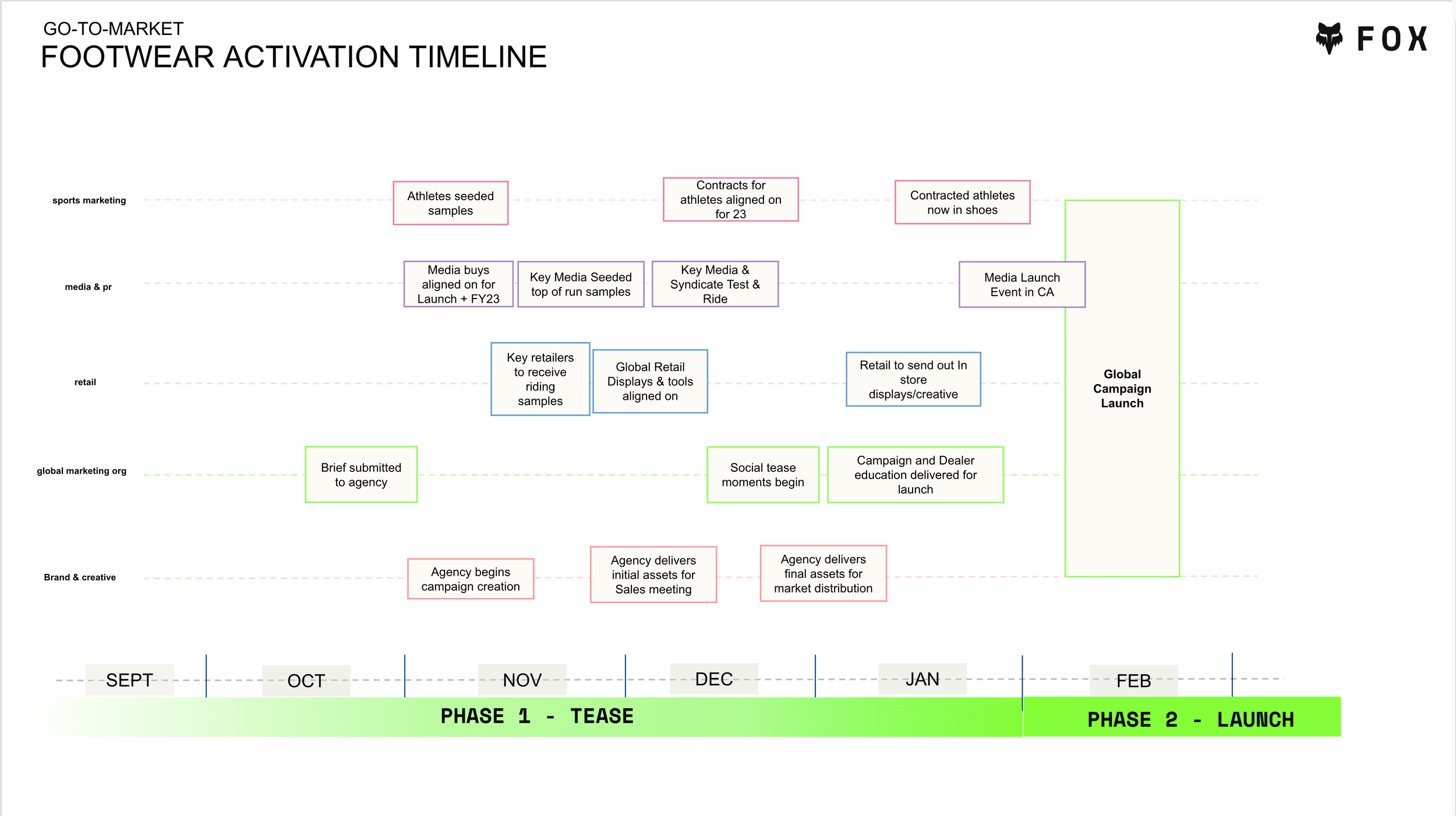 From long forecasting to detailed Global Marketing strategies, at Fox Racing I was able to re-define the Go-To-Market Strategy and how it was executed within the Global regions, resulting in greater collaboration and more effective adoption of assets and marketing materials by owned and third party channels.